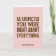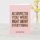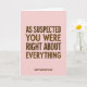 This card features a blush pink background with lots of open space that lets the message breathe, creating a calm, affectionate mood ❤️. Centered in the upper-middle area, the large text reads “AS SUSPECTED YOU WERE RIGHT ABOUT EVERYTHING” in a friendly, thick sans-serif style, colored deep chocolate brown. The roomy spacing around the words gives it a gentle, teasing tone, like a fond admission shared with someone you trust. Near the bottom center, a smaller line of text reads “HAPPY MOTHER’S DAY,” also in the same dark brown, keeping the layout balanced and easy to read. The contrast between the warm brown lettering and the soft pink field feels cozy and tender, like a quiet smile exchanged across the room 🌼. With no illustrations or extra decorations, the focus stays on the words and the affectionate humor they carry. The top portion remains mostly empty, framing the headline and drawing the eye downward to the smaller greeting at the base. The overall look is minimal: blush pink background, dark brown text, and centered lines with generous margins.