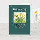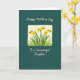 This card features a calm, illustrated layout with a deep, muted teal background that sets a cozy, affectionate tone ❤️. In the center sits a vertical rectangle bordered by an off-white, slightly uneven frame, like a softly worn mat around a picture. Inside the panel, six trumpet-shaped yellow flowers rise on slim green stems, their petals bright and their centers warmed with orange, leaning close together like a small bouquet shared between loved ones. Green leaves scatter around the stems, adding a fresh spring feel with gentle, textured shading that resembles colored pencil. Near the top, the phrase “Happy Mother’s Day” appears in white, flowing lettering, centered above the framed artwork. Near the bottom, “To a Wonderful Daughter” is also centered in matching white lettering, balancing the layout and linking the message across generations 👩. The off-white border has softly irregular edges that lightly ripple against the teal backdrop.