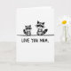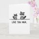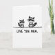 This greeting card shows two small masked forest creatures drawn in soft grayscale, standing close like a caring parent and child with a gentle, affectionate mood ❤️. The smaller one sits to the left, facing forward with wide dark eyes and a tiny smile, as if soaking up attention. The larger companion stands just to the right, angled slightly toward the smaller figure, giving the scene a quiet, protective closeness. Their fur is shaded in charcoal and ash tones with white accents marking their faces and ringed tails, and a light texture adds a cozy, pencil-like feel. A single thin horizontal line beneath their feet grounds them near the upper half of the front, leaving lots of open white space around them. Centered below the pair, the message “LOVE YOU MUM” appears in thick, hand-drawn uppercase letters in dark gray, easy to read at a glance 🌼. The larger creature’s head sits a touch higher, and both tails curve subtly inward toward the middle above the simple grounding line.