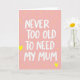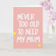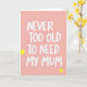 This greeting card features the phrase “NEVER TOO OLD TO NEED MY MUM” centered in crisp white lettering, with slightly uneven strokes that feel like a tender note left on the kitchen table ❤️. The words sit prominently against a soft pastel pink background that suggests gentle closeness and everyday care. Small yellow heart shapes are scattered across the surface like affectionate confetti, adding a light, friendly rhythm around the message. A few larger yellow hearts are spaced farther apart, guiding your eye from corner to corner as if following warm thoughts back home. The overall layout keeps the text easy to read, with the white letters standing out clearly while the hearts stay in the background as supportive accents. The mix of pink and yellow creates a cozy, affectionate scene, like a hug that lingers a moment longer 🌼. Several bright yellow hearts float near the edges, with bigger hearts punctuating the pink field around the centered white text.