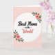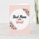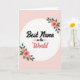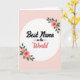 This card features a soft blush pink background with a bright white circle centered like a spotlight for a loving message ❤️. Inside the circle, the words “Best Nana” sit near the top in thick, flowing black lettering that feels warmly confident. Just below, “in the” appears much smaller in black, with a short horizontal line on each side that gently points your eye downward. The word “World” is placed beneath in a cheerful coral tone, with rounded, looser lettering that adds a friendly, affectionate lift. Two floral clusters decorate the circle on opposite corners, as if they’re leaning in toward the message like a hug. The upper-right cluster and lower-left cluster show soft pink rose blooms with layered petals, deep centers, and fresh green leaves, giving the design a tender, caring mood 🌼. The pale pink field stays smooth and uncluttered, making the white circle and the rose details stand out clearly. The roses have a light painted look with subtle shading, while the coral “World” pops against the white circle.