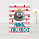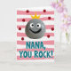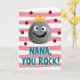 This design shows a smiling, human-like gray pebble near the top, speckled with tiny dots and drawn with big white eyes, black pupils, and an upturned black grin that feels like a friendly wink ❤️. A bright yellow three-point crown rests on its head, giving it a sweet, affectionate “you’re special” look without needing any extra characters. Behind it, the background is filled with soft, wavy horizontal stripes that alternate between light pink and white. Deep red circular dots are scattered across the stripes, like confetti drifting around a favorite person. In the lower half, large teal-blue text with a white outline reads “NANA, YOU ROCK!” and the letters sit centered beneath the crowned pebble. The layout keeps the character above and the message below, making the eye travel naturally from the smile down to the words. A gentle, cozy mood comes through in the warm pinks and the pebble’s cheerful expression, like a small visual hug 🌼. The teal lettering sits against the pink-and-white striped background, with red dots sprinkled around it.