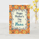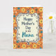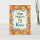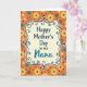 This design shows a decorative, curving frame centered on the card, holding a Mother’s Day greeting that feels affectionate and close ❤️. “Happy Mother’s Day” sits prominently in the middle in a classic serif style, while “Nana” appears just below it in a flowing teal lettering that adds a tender, special touch. The words are placed within a soft, creamy interior that makes the message easy to read against the busier background. Around that center panel, the backdrop is a repeating garden pattern on a bright tangerine-orange field, like a cheerful spring cloth. Stylized flowers in sunny yellow, calm blue, and crisp white mingle with small earthy-brown shapes and tiny dark dots, giving the scene a cozy, friendly rhythm 🌼. The frame’s outline is detailed with curled scrollwork and small flourishes that feel like careful doodles, gently guiding your eyes back to the center text. Creamy center panel, teal “Nana,” and the orange floral background create a layered look with yellow, blue, white, and brown accents throughout.