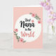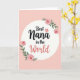 This card features a creamy white circle centered on a soft pastel peach background, creating a calm, affectionate stage for the message ❤️. Near the top of the circle, the words “Best” and “in the,” appear in black flowing lettering, spaced to gently frame the name below. “Nana” sits larger in the middle in black, giving it pride of place like a warm hug in text form. Just beneath, “World” is written in coral-pink, adding a sweet, rosy emphasis that feels like a loving wink. A small coral floral asterisk rests between the upper words, acting like a tiny bouquet tucked into the line. Four pink rose blossoms with deeper coral centers curve around the circle’s edge, their petals leaning inward as if gathered close in friendship. Sprigs of rich green leaves fill the gaps, softening the circle’s outline and adding a garden-fresh touch 🌼. The roses partially overlap the white circle at the corners, with the top-left and bottom-right blooms appearing closest to the lettering.