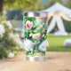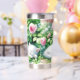 Personalized thermal tumbler. Adorable white fluffy kitten sleeping under a pink rose bush watercolor ai art.