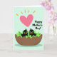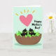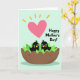 This card shows a simple illustration of a brown, bowl-shaped nest packed with lime-green leaves, creating a snug little setting. Two small black birds sit close together in the nest, their bodies angled inward as if sharing a private moment of affection ❤️. Each bird has a bright yellow pointed beak, oversized round eyes with green rings and tiny white pupils, and soft pink blush on their cheeks that makes their gaze feel tender and friendly. Above them floats a soft pink heart, with short golden-orange dash marks radiating outward like a gentle glow. The background is a pale mint green, keeping the scene light and airy 🌼. On the right side, black hand-drawn lettering is placed in a tall vertical stack, standing out clearly against the mint backdrop. The heart sits slightly left of center above the birds, and the orange dash marks fan outward around it.