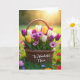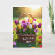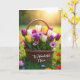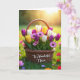 This card features a woven rustic basket centered in the scene, overflowing with spring flowers in sunny yellow, soft white, and deep purple, with small daisy-like blooms in pale lavender tucked between them. The basket sits in a green outdoor setting, and the flowers lean toward one another as if sharing a gentle, friendly closeness ❤️. Warm golden light, like early morning or late afternoon, wraps around the petals and leaves, giving their edges a softly glowing look. The background fades into a blurred garden-like field, keeping your attention on the bouquet and adding a calm, intimate mood. Across the front of the basket, a flowing line of text reads “To a Wonderful Niece,” placed neatly at center and standing out in a dark ink. The mix of the basket’s textured weave and the smooth petals creates a cozy contrast, like a small gift set down with care 🌼. Tiny points of light catch along the tulip petals while the surrounding greenery melts into a gentle haze behind the basket.