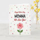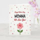 This card features a loving message centered on the Italian word for grandmother, “NONNA,” set in large black sans‑serif letters that feel steady and proud ❤️. Above and below it, smaller red cursive-style lines add a gentle, affectionate touch, like a soft note tucked around the main word. Under the text, a stylized rose opens with layered soft pink petals that draw the eye inward. At the flower’s center sits a deeper red heart shape, hinting at closeness and care without needing extra words. A bright green stem extends down with two simple leaves, keeping the illustration sweet and uncomplicated. The background is an off‑white tone sprinkled with small round dots that resemble confetti, adding a light, friendly mood 🌼. The dots vary in berry red, pastel pink, and muted aqua, scattered loosely across the space. The rose shows soft pink petals with a dark red heart at the center and a green stem with two leaves beneath it.