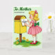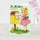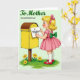 Designed with a nostalgic illustration style, the scene shows a young girl with golden curls and a pink hair bow slipping a small note into a sunny yellow, rounded-top mailbox ❤️. Her rosy cheeks and intent side profile suggest a gentle devotion, like she’s carefully sending love to someone she trusts. She wears a pink dress with puffed sleeves and a green bow tied at the back, along with white socks and shiny red strap shoes. The girl and mailbox sit near the center against a soft light-green background, keeping the focus on their quiet, affectionate moment. At the base of the wooden post, a patch of green grass is dotted with yellow flowers with warm red centers 🌼. Across the upper area, the message “To Mother ON MOTHER’S DAY” appears in green lettering, with “To Mother” leading and “ON MOTHER’S DAY” following beneath it. The mailbox stands bright yellow with a curved lid, set beside the small cluster of flowers and grass.
