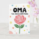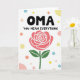 This card centers on the large black word “OMA” near the top, giving it a strong, affectionate focus ❤️. Just beneath it, the phrase “YOU MEAN EVERYTHING” appears in smaller black lettering, aligned neatly under the main word. The background is bright white, leaving lots of open space that makes the message and artwork feel airy and close. In the lower half, a single rose blooms with coral-pink petals edged in thin white lines, like a gentle outline that adds definition. A deep green stem rises from the bottom with two smooth leaves, creating a calm, steady base for the flower. Around the text and rose, scattered polka dots in soft sky blue, pale yellow 🌼, peach, and blush pink float like quiet confetti, adding a friendly, romantic sparkle without crowding the design. The rose sits slightly below center, with its petals opening outward while pastel dots of different sizes drift across the white space.