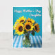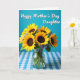 Designed with a cheerful still life, the card centers on a full bouquet of golden-petaled flowers with deep brown centers that lean toward each other like close friends ❤️. Smaller star-shaped blossoms in a soft blue-purple nestle between the larger blooms, adding a gentle contrast that feels like a quiet, caring conversation. The arrangement sits in a clear glass vase, where green stems are visible through the water and curve slightly with a natural, relaxed grace. A checkered cloth spreads across the tabletop below, alternating white squares with bright sky-blue for a cozy, homey touch. The background is a smooth field of vivid cyan that keeps everything airy and lets the yellows stand out 🌼. Near the top, a flowing line of white text is placed above the flowers, standing out clearly against the blue. Soft, even light highlights the petals and leaves and casts mild shadows around the vase and fabric folds. The glass vase shows crisp green stems submerged in clear water, set against the blue-and-white checkered cloth.