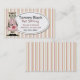 Cute pet sitter business card done in a pale tan, dusty rose and white striped background, and country graphics of a dressed up gray cat holding a flower. An white oval text area, in the middle, has a khaki oval border and the text is completely customizable to suit your needs. Fun way to advertise your business.