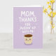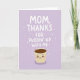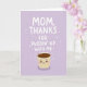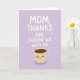 This design shows a soft lavender background that sets a calm, cozy mood, with a cute dessert theme that feels like a warm hug ❤️. Centered on the front, large white lettering reads “MOM, THANKS FOR PUDDIN’ UP WITH ME,” giving the message a funny, affectionate twist. The text sits in the middle of the card and stands out strongly against the purple, with the words stacked in an easy-to-read layout. Small white dots are scattered around the lettering like confetti, adding a light, celebratory sparkle without crowding the space. Along the bottom, a beige paper cup character holds a dark brown pudding-like treat, tying directly into the pun. The cup has closed, happy eyes and soft pink blush on its cheeks, as if it’s sharing a sweet, grateful moment with Mom 👩. Short white rays around the cup suggest a gentle glow, and the overall illustration stays simple with smooth shading and tidy shapes. White dots and little white lines float around the cup near the lower edge on the lavender background.