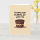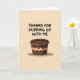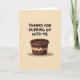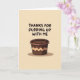This card features a simple digital illustration with a dessert pot centered near the bottom, filled with dark, creamy pudding that looks rich and comforting. The pot is shaded in deep brown and wrapped with a wavy caramel-beige band around the middle, like a sweet hug that hints at closeness and steady friendship ❤️. A soft swirl sits on the pudding’s surface, adding a gentle, inviting touch without extra fuss. Above the illustration, the phrase “THANKS FOR PUDDING UP WITH ME” appears in rounded, thick lettering in a matching brown, placed near the top and easy to read. The roomy cream background keeps everything calm and cozy, letting the message and dessert feel like a shared little treat between two people. A faint shadow under the pot adds a bit of depth, as if it’s resting on a tabletop during a quiet, caring moment 🌼. The overall look stays warm and minimal, with smooth lines, soft browns, and a pale cream backdrop framing the centered pot and top text.