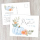 A cute baby boy shower invitation postcard with "A Sweet Little Pumpkin Is On His Way" written in a mix of modern light blue typography and a stylish script with a heart swash, and a watercolor bouquet of a pastel blue pumpkin, orange florals and greenery. On the back, easily personalize the mother's name in a modern blue script and the shower details in simple soft grey typography.