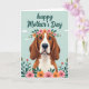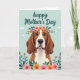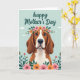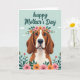 This card features a sweet-faced dog with long, droopy ears and soft brown fur, looking straight ahead with a tender, trusting expression that feels like a quiet moment of friendship ❤️. A ring of flowers rests on its head, mixing coral, soft pink, and warm orange blossoms with deep green leaves. Matching flowers and slender green stems gather around the lower area, as if the pup is being lovingly framed by a simple garden border. The background is a muted aqua tone that keeps the scene calm and airy. Near the top, a flowing teal message is written in a gentle cursive style, centered above the dog’s head. The illustration uses smooth, flat shapes with soft shading, giving it a cozy storybook look without lots of extra texture. Small white cloud shapes sit in the upper corners, adding a light, dreamy touch 🌼. The floral crown shows clustered petals in coral, pink, and orange with dark green leaves arcing over the dog’s forehead.