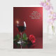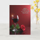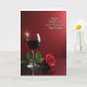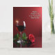 This design shows a deep red still-life scene with a tall stemmed glass on the left, filled with dark crimson liquid that suggests a shared toast ❤️. A small star-like glint flashes off the rim, like a quiet sparkle catching someone’s eye across the table. On the right foreground, a single red flower lies gently on its side, its layered petals opening in a way that feels tender and affectionate. Both the glass and the flower sit on a glossy reflective surface, doubling their shapes in soft mirror images that add a romantic, candlelit mood. Behind them, the background fades through rich reds, darker near the bottom and lighter toward the top, wrapping everything in a warm glow. In the upper right area, a short message appears in white, written in flowing cursive-style lettering that stands out against the red. The flower’s petals look velvety and slightly curled at the edges, with a faint highlight along the topmost layers 🌼.