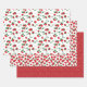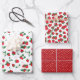 Strawberry themed wrapping paper sheets with three matching strawberry patterns: one sheet with red strawberries, leaves, and white flowers, one sheet with lots of strawberries, and one red sheet with little strawberry seeds. Perfect wrapping paper sheets for strawberry themed birthdays, strawberry themed baby showers, and strawberry themed bridal showers.