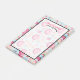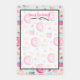A yummy set of large sized sticky notes with a delicious pattern design. Glazed pink donuts with sprinkles. Mouth watering cupcakes in pink and blue with rosettes and strawberries on top. Some pastel pink french pastry macarons and little pink candy buttons also decorate this pattern full of sweet treats. A semi- transparent overlay islayered over top so you can write legibly over the pattern design. Text at the top says "sweet reminders" and can be changed / personalized to your liking.