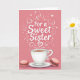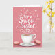 This greeting card features a gentle rose-pink background filled with small white hearts and curling white lines. Near the top, the words “For a Sweet Sister” appear in white, flowing lettering with a brushed look, centered and easy to spot. Below the text sits a white teacup on a matching saucer, with a lace-like pattern around the rim. Thin wisps of steam rise from the cup, giving it a cozy, just-made feel. Two pink macarons rest nearby, showing ruffled edges and a dark chocolate filling in the middle. The whole scene feels calm and caring, like sharing a quiet treat and a kind moment together. It’s a meaningful card to give a sister because it pairs a simple message with a warm, comforting picture that says “I’m thinking of you” 🥰❤️.