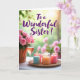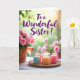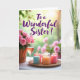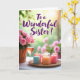 Designed with a softly lit, serene backdrop, this card features a gentle still-life scene that feels like a quiet moment shared between close friends ❤️. Near the top center, the message “To a Wonderful Sister!” appears in flowing purple lettering, standing out clearly against the light background. Below, a white tabletop holds a wicker basket on the left, filled with pink roses in mixed stages of bloom, their petals leaning toward one another like a tender embrace. Next to the flowers sits a slim glass of blush-colored rosé that catches the light with a subtle shimmer. On the right, several cylindrical candles in pastel shades—sky blue, peach, cream, and soft coral—stand together on a woven mat, their small flames glowing warmly. The background fades into soft green tones with scattered pink floral hints, creating a garden-like blur 🌼. The candlelight reflects faintly on the smooth surface while the basket’s woven texture and the roses’ layered petals add cozy detail. In the upper half, the purple text sits above the arrangement, and behind it the out-of-focus greens and pinks form a gentle bokeh.