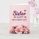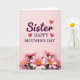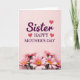 This card features a warm Mother’s Day message centered in the upper half of a tall layout, set against a soft blush pink background. The word “Sister” appears first in a deep plum, flowing cursive-style lettering, giving it an intimate, sisterly closeness ❤️. Just beneath, “HAPPY MOTHER’S DAY” is written in the same plum color in a neat, classic serif style, aligned to sit comfortably under the larger word. Small heart shapes, lightly raised in appearance, sit near the lettering as gentle accents that suggest affection without crowding the page. The lower third is filled with a wide band of daisy-like flowers, their many petals shifting from pale pink at the edges to richer rose tones toward the centers. Slender green stems and leaves peek upward from the bottom edge, adding a fresh, garden feel 🌼. Each bloom has a bright yellow-orange center that stands out sharply against the pink petals.