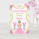 This sweet sixteen birthday card invitation features an elegant gold frame, a beautiful princess with blonde hair and a pink dress, flowers and a balloon.