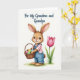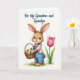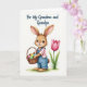 This card features a friendly, human-like brown rabbit with soft, textured fur, extra-large ears, and a wide smile that feels like it’s meant for someone close 🐰. Its dark eyes shine and its cheeks have a gentle rosy tint, giving it a tender, affectionate look. The rabbit wears light blue denim overalls over a pink-and-white striped shirt, adding a cozy springtime touch. In its paws is a woven basket brimming with decorated eggs in blue, green, and pink, their glossy patterns catching the light. Nearby, a tall pink tulip rises with petals opening outward, like it’s leaning in as a sweet companion 🌷. A small scatter of green grass sits along the bottom edge to anchor the scene against the white background. Across the top, a dark blue cursive-style message is placed in a smooth arc above the rabbit. The white backdrop makes the pink tulip and the basket of colorful eggs stand out beside the rabbit’s overalls.