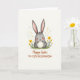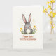 Designed with a soft watercolor look, the illustration features a long-eared bunny 🐰 in gentle gray with a white belly and tall ears lightly tinted pink inside. Its simple dark eyes, small smile, and rosy cheeks give it a shy, affectionate expression, as if it’s quietly enjoying someone’s company. The bunny sits among bright yellow six-petaled flowers and fresh green leaves, with slender dark stems adding contrast against the pale fur. The open white background keeps the scene airy and calm, like a quiet spring moment shared between close friends. Below the artwork, a flowing handwritten-style message appears in warm burnt orange, centered near the bottom. A few small leaf shapes and petals seem to lean inward toward the bunny, adding a subtle sense of closeness 🌷. The yellow blossoms cluster around the bunny’s feet while the rest of the background stays crisp white.