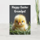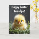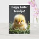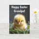 This card shows a fluffy bright yellow hatchling nestled into a bed of slender green plant strands like a tiny nest, giving the scene a gentle, caring feel. Its downy feathers look soft and layered, as if you could almost feel the texture with your fingertips. Big dark shiny eyes face forward with a trusting, curious look, and the small orange beak adds a warm accent against the yellow. Soft, diffused lighting falls across the little creature, creating tender shadows that make it seem quietly watched over. The background is a deep dark gray that fades back, keeping attention on the hatchling and its cozy shelter. Near the top, a seasonal Easter greeting is set in white text, centered above the image, with wording that addresses an older loved one, like a note meant for someone special 🌷. The overall layout feels calm and affectionate, like a small moment of closeness captured in nature 🐰. The white lettering sits clearly above the yellow hatchling, with the green nest filling the lower portion against the dark gray backdrop.