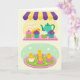 This card shows a split layout with a sweet bakery scene on top and a cozy gathering of little birds below, all in soft spring pastels 🌷. In the upper section, a yellow-and-purple striped awning hangs over a soft yellow background, where “HAPPY EASTER” appears in large letters near the top in a darker contrasting color. Four frosted pastries sit on a pink shelf dotted with white circles, their wrappers in pink, purple, and teal, each topped with a small red cherry-like accent. A small yellow bird peeks from behind the treats with a tiny orange beak, leaning near a smooth turquoise teapot as if waiting to share a quiet snack with a friend 🐰. In the lower section, five fluffy yellow birds with simple black eyes and orange beaks cuddle close together inside pastel pastry cups, creating a tender, together-at-the-table feel. They sit on a mint-green circular platform edged with pink dots, like a little stage for a spring tea party. Behind them, a pale green background sprinkled with soft white dots adds a light, airy look, and the bottom panel centers the bird group within the round frame.