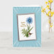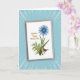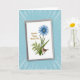 Designed with a white greeting card set at a slight angle against an azure background, with thin white rays stretching in from the edges like a soft burst of light. On the card, a large many-petaled flower in deep blue draws the eye, its round center filled with concentric rings in pale blues and warm browns that feel quietly romantic ❤️. Below it, lush green stems and a detailed fern frond fan upward, creating a cozy garden setting that suggests a gentle, caring presence. Nestled among the leaves is a small brown feathered bird, its patterned plumage and calm posture giving the scene a tender, companionable mood. In the upper left area, a short message of affection appears in flowing golden-brown lettering, balanced neatly against the open white space. The warm text color echoes the earthy tones in the flower’s center and the bird’s feathers, tying the whole design together without feeling busy 🌼. The blue flower sits centrally above the greenery, while the bird rests slightly lower and to one side, surrounded by crisp white margins.