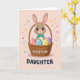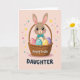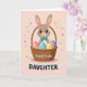 This card shows a sweet cartoon long-eared bunny 🐰 peeking out of a woven brown basket, with glossy dark eyes, rosy cheeks, and a neatly tied teal bow tie that gives it a tender, friendly look. Nestled in the basket are four decorated eggs, each with white horizontal stripes over soft pastel shades of pink, teal, yellow, and lavender. The background is a gentle blush pink, lit in a soft way that makes the scene feel like early spring. Small stars and round confetti dots in mixed colors drift around the bunny, adding a light, celebratory touch without crowding the main image. The bunny’s slightly tilted head and bright gaze suggest it’s sharing a quiet moment with someone close, like a friend leaning in for a cheerful hello 🐇. Along the bottom, a short holiday greeting sits centered in rounded, friendly lettering, set in a darker tone that stands out against the pale background. A few tiny star shapes hover near the top corners while confetti circles sprinkle the space around the basket rim.