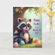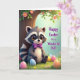 This card features a cute raccoon-like woodland animal with a masked face and striped tail sitting on bright green grass dotted with tiny wildflowers 🌷. Its fur shifts from deep charcoal to soft white, and a neat purple bow tie gives it a sweet, date-ready look, as if it dressed up for someone special. Tucked against a sturdy tree trunk, it’s framed by leafy branches sprinkled with small pink blossoms, adding a gentle, affectionate backdrop. The animal’s oversized eyes glow with warm amber tones and glossy highlights, and its slight smile with a hint of pink tongue suggests a friendly, tender curiosity 🐰. Around its paws, smooth oval egg shapes in pastel blue, pink, yellow, and orange catch the light with a soft sheen, like little gifts left for a friend. The background fades into a pale aquamarine gradient, keeping the scene light and airy like an early spring morning. A short message appears in purple lettering near the top, standing out clearly against the lighter sky area. The tree bark shows subtle texture, and the pink blossoms cluster along the upper branches above the animal’s head.