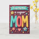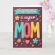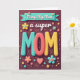 This greeting card features large raised letters spelling “MOM” in a candy-like style, set on a deep mulberry background that makes the colors feel extra cozy and affectionate ❤️. The first “M” is bright aqua, the “O” is soft coral, and the last “M” is sunny yellow, each with subtle ridges that resemble piped frosting. Near the top, the words “a super” appear in a flowing cursive line, leading the eye into a teal banner stretched across the upper edge. Inside that banner, “To my Step Mom” is written in small white lettering, centered and easy to spot. Around the main word, pastel flower shapes in pink, blue, and yellow mingle with tiny multicolored dots like sprinkles, adding a gentle, friendly energy 🌼. Soft shadows under the letters, banner, and flowers make each piece look slightly lifted, like layered decorations placed with care. The top teal banner has curled ends, with small blossoms and scattered dots clustered nearby against the dark background.