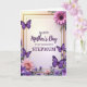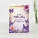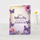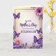 This card features a thin golden border framing a softly glowing center, set on a gentle gradient background that shifts from warm cream to light lavender. Centered in the open space, the message reads “HAPPY Mother’s Day TO MY WONDERFUL STEPMUM,” with “HAPPY” and “TO MY WONDERFUL STEPMUM” in neat uppercase lettering and “Mother’s Day” in a flowing, cursive-style line, all in deep purple for a warm, affectionate tone ❤️. Around the border, flowers and greenery curl inward like a caring embrace, giving the layout a close, companionable feel. Four purple butterflies with crisp white markings flutter across the frame, adding a light, romantic sense of movement as if they’re drifting toward the words. In the lower-left corner, a large blush-pink flower with many layered petals sits like a gentle focal point, softened by nearby leaves and small purple blooms. In the upper-right, a bright pink daisy-like flower with a dark center balances the design, surrounded by sprigs of purple flowers and fresh green foliage 🌼. The corners and edges are filled with intertwined stems, scattered blossoms, and the four butterflies spaced around the golden outline.