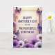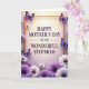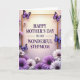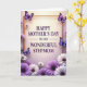 This card features a glowing golden rectangular frame that sets a gentle, affectionate tone ❤️. Centered inside the frame, dark purple serif text reads “HAPPY MOTHER’S DAY TO MY WONDERFUL STEPMOM,” with the lines stacked neatly and easy to read. A soft halo of light behind the words makes the center feel tender, like a quiet moment shared between close family. From the lower corners and along the sides, large daisy-like blossoms curl inward as if they’re leaning closer in a caring embrace 🌼. The flowers mix soft lavender and white petals, and their darker centers add depth and contrast against the warm gold. Nearby, several purple butterflies with black detailing hover and rest along the frame, adding a light, airy sense of movement. The overall palette stays in gentle purples, crisp whites, and golden accents, with the butterflies scattered around the border and the blossoms clustering most densely near the bottom edges.