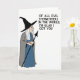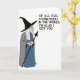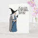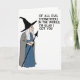This card features a cartoon-style older woman on a plain white background, shown in profile on the left as she turns her gentle gaze to the right with a small, knowing smile ❤️. She wears a tall black pointed hat, and long white hair spills down beneath it, softening her face and adding a tender, storybook charm. A dark blue outfit sits under a flowing gray cloak, giving her a slightly mysterious look that still feels friendly, like she’s sharing an inside joke with someone she cares about. In her hand, she holds a slim dark staff topped with an arrow-shaped finial, angled upward as if guiding attention across the design. On the right side, large black sans-serif text is stacked in all caps and reads, “OF ALL EVIL STEPMOTHERS IN THE WORLD, I’M GLAD I GOT YOU,” balancing the figure with a teasing, affectionate tone 🌼. The spacing leaves plenty of white space around the words, making the message easy to read while the character’s posture keeps the mood warm and companionable. The hat is solid black, the cloak is light gray, and the lettering is deep black against the white background.