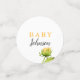 Sweet and rustic sunflower baby shower confetti featuring watercolor illustration of a yellow sunflower with a barn wood background. The text says "a baby is blooming."