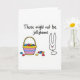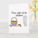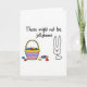 This card shows a mostly white background with a striped basket in bright pink, blue, and yellow at the center, its curved handle framing a pile of egg-shaped sweets. The candies are colored red, green, purple, and orange, with a shiny look that makes them seem freshly dropped into the basket. Off to the right, a simple black-outlined bunny head 🐰 looks toward the treats, its small eyes and tiny pink nose giving it a tender, curious expression, like it’s sharing a private joke with you. A separate oval shape beneath the head hints at the bunny’s body in a loose, minimal way, adding to the gentle, friendly tone. Across the top, the phrase “Those might not be jellybeans,” appears in thin black lettering, slightly arched over the scene. The wide open space around the drawing keeps the focus on the basket and the bunny, while the humor reads like a soft nudge between close friends. A small scatter of colorful sweets sits near the basket on the white ground, with a little spring touch suggested by the bright palette 🌷.