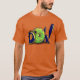 My 11 yo wore adult XL (5’7” 165#). The 8yo is small framed. She wore adult small and tied it in the back. Grandma wore adult large with long sleeve shirt underneath. Tall girl adult medium. Dark haired male adult large. Good quality dark Heather gray, Gildan brand shirt. -it was next up from basic choice and cost about $20 per shirt. Not too thick or thin. Washed and dried well, no major shrinkage. Not see-through. Can wear a bra under it fine. Screen print is just as shown and well done, front and back.