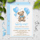 A fun play on words with these we can "bearly wait!" teddy bear baby shower invitations. Featuring a sweet little teddy bear with a blue bow, baby blue heart shaped balloons and blue hearts.
