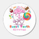 A large, vibrant graphic of a smiling tooth character in the center of the shirt. The tooth has cute eyes, candy bean nose, and is holding a lollipop. Surround the tooth with a colorful array of candies: gummy bears, jelly beans, peppermints, chocolates, and lollipops.