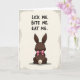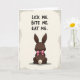 This card features a dark chocolate-brown bunny-shaped treat shown from behind, with tall upright ears and a small pink bow tied high on its back for a flirty touch 🐰. A fluffy cream-colored tail sits low and centered, suggesting softness against the smooth candy surface. A faint shadow beneath the figure helps it feel slightly raised from the page, while the background stays a quiet light beige so the bunny stands out. Near the top, three short lines of text read “LICK ME.”, “BITE ME.”, and “EAT ME.”, stacked one under another in thick black lettering. The cheeky wording and the coy rear view create a friendly, teasing mood, like an inside joke shared between close friends 🌷. Soft gray shading gathers around the outer edges like a gentle vignette, guiding the eye toward the center. The bunny’s deep brown shape sits squarely in the middle, with the pink bow and cream tail as the brightest accents.