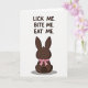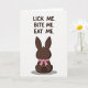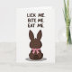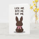 On the front of the card a dark brown chocolate-shaped bunny 🐇 is shown from behind, with tall upright ears and a small round tail that adds a sweet, shy touch. A bright pink ribbon is tied in a neat bow around its neck, like a flirty little gift waiting to be noticed. The background stays white and open, letting the simple scene feel like a private note between close friends or sweethearts. The bunny sits low in the center, anchored by a soft gray shadow beneath it for a hint of depth. Above the figure, three short lines of uppercase text read “LICK ME. BITE ME. EAT ME.” in the same dark brown color as the bunny. The words are placed near the top half with generous spacing, giving the message room to linger like teasing banter. A single small 🌷 detail can be added nearby to soften the cheeky tone without distracting from the main figure. The pink bow’s loops and trailing ends stand out sharply against the deep brown shape.