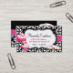 Pretty bakery business card done in a black and white damask, with pink polka dots, a bright pink band, across the middle, and a decorative black edged white text area, on the front. Adorable colorful graphics of pink, white, and green cupcakes and cookies, decorate both sides, of the text plaque. Text is fully customizable to suit your business needs. Great for at home bakers too.