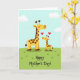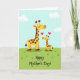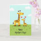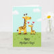 Designed with two stylized long‑necked ungulates in a gentle landscape, the scene shows a taller adult on the left and a smaller youngster on the right, leaning in with an affectionate, upward gaze ❤️. The adult has a sunny yellow coat with warm brown spots, while the smaller one mirrors the look in softer tones, both with dark, expressive eyes and a light blush on their cheeks. Two red heart shapes float above the smaller figure, adding a quiet note of closeness between them. They stand on a green grassy stretch with simple tufts scattered around their feet, keeping the setting calm and open. The sky is a pale pastel blue with rounded white clouds drifting across, giving the background an easy, airy feel 🌼. Along the bottom, the text “Happy Mother’s Day!” is centered in flowing dark lettering that stands out against the lighter ground. The adult’s long neck curves slightly toward the youngster, and the pair are framed by the soft clouds and small grass details.
