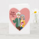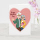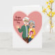 This greeting card shows an elderly couple standing close together inside a large pink heart. They both wear glasses and have wide, friendly smiles that make the scene feel caring and real. The man has neatly kept gray hair and a gray beard, and he wears a green cardigan while lifting one hand in a welcoming wave. The woman has a smooth gray bob haircut, a yellow cardigan, and she leans in as he wraps an arm around her shoulders. She holds a pink gift box with white polka dots and a red ribbon, hinting at a sweet surprise shared between them. The background is mostly soft pink tones, with the heart shape framing them like a cozy spotlight. The words “Happy Valentine’s Day” appear prominently on the front in flowing pink lettering, placed near the top of the heart. It feels meaningful to give because it celebrates lasting love and steady companionship in a simple, happy moment 🥰❤️—perfect for sharing Valentine’s Day sentiments.