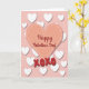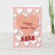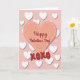 This greeting card features a large peach‑pink heart centered on a pale pink background, setting a sweet, affectionate mood ❤️. Across the middle of the heart, the words “Happy Valentine’s Day!” appear in deep crimson, flowing lettering that feels like a gentle note shared between two people 🥰. A dashed white border runs around the big heart like stitching, adding a cozy, crafted look. Scattered behind it are many small white hearts in different sizes and angles, like confetti drifting across the page. Each tiny heart has a soft shadow that makes it look slightly raised, giving the design a light layered depth. Near the bottom, “XOXO” sits under the main message in chunky, dimensional red letters that stand out against the soft pink. The overall palette stays in blush pinks, crisp whites, and rich reds, with the central heart and its stitched edge clearly framed by the floating mini hearts.