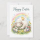 A cozy watercolor sheep resting on green grass under a soft rainbow. Featuring a cute chick and vibrant spring flowers for a joyful greeting.